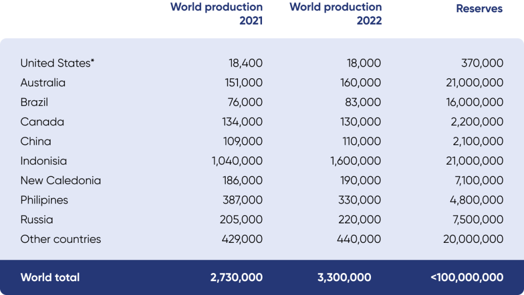While nickel is a common element on earth, it is rarely concentrated into economic deposits near surface. Deposits occur in the form of nickel laterite (oxide) or nickel sulphide with nickel laterite now representing 70% of global nickel production. The major producing countries are Indonesia (50%), Philippines (11%), Russia (7%), New Caledonia (6%), Australia (5%) and Canada (4%). Global annual nickel production is approximately 3 million tonnes (~$US 42 billion industry) and growing at a rate of up to 7% per year.
